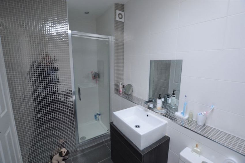 The modern family bathroom has both a bath and a separate walk in shower. There is a basin with mixer tap over, a WC, and a stainless steel towel rail.